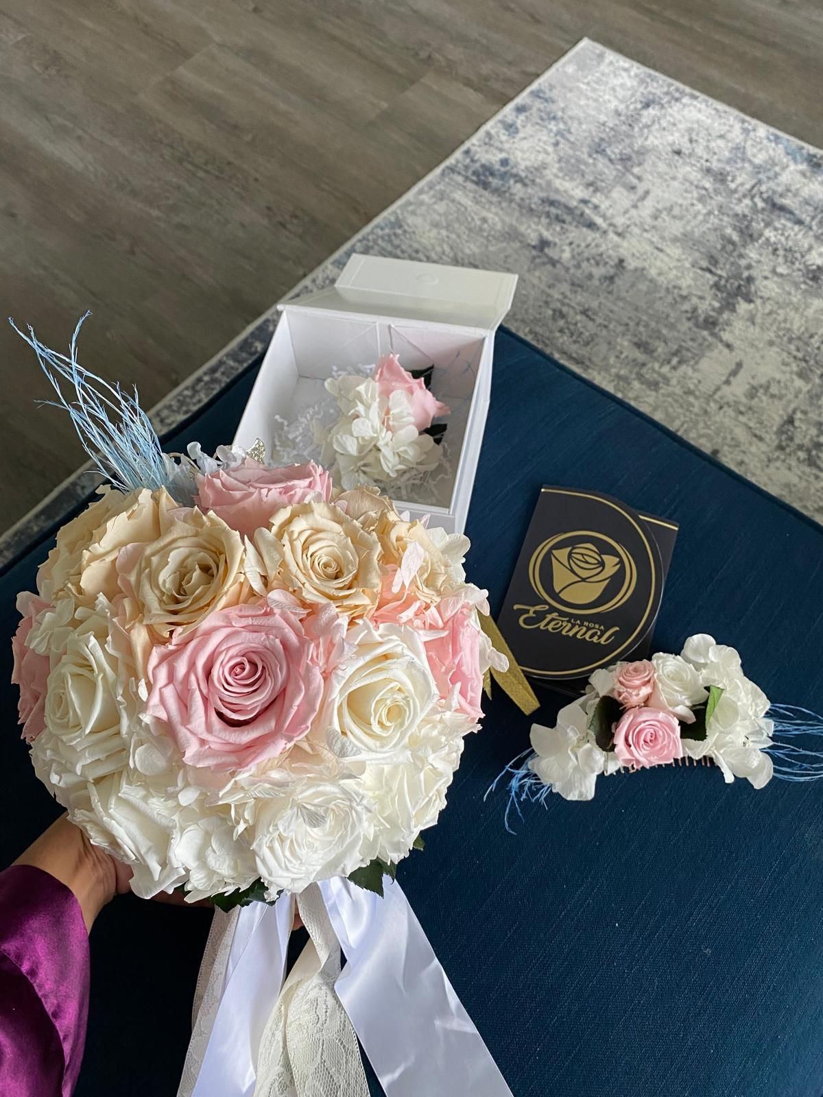 "Juan Carlos and I have a blessed love story. We fell in love as teenagers, then life took us apart on different paths and now life brings us back together. Our union is a gift from God, every decision we make and in every thing we do we feel that connection. It happened to us in a very special way with the colors and details that you can see in the photos of our celebration. Every color, every rose, every detail was perfect. We look at our photos and feel how special everything has been. Thanks to La Rosa Eternal for being part of our love story." Arsenia